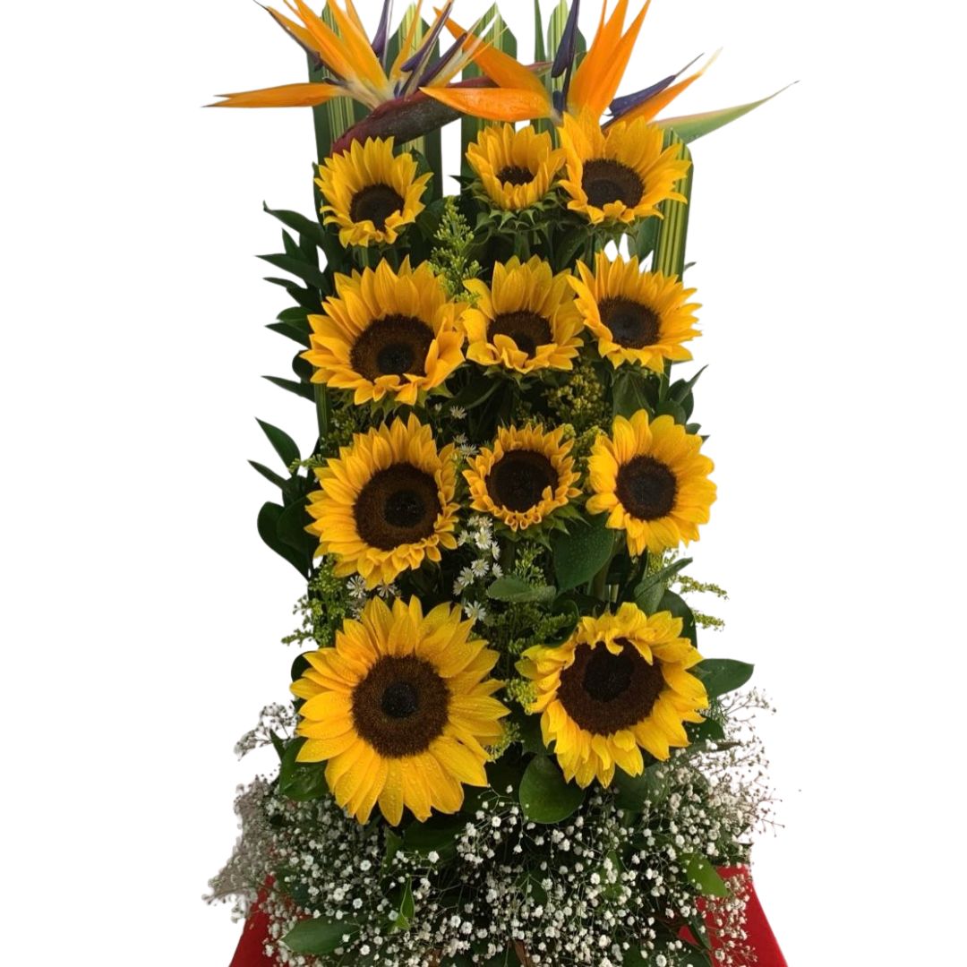 Amanecer Dorado – Girasoles, Aves del Paraíso y Perla