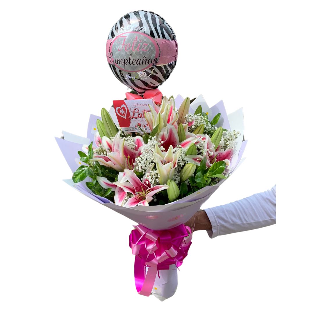 El «Buchón Imperial» es un arreglo floral sofisticado que transmite elegancia, frescura y distinción. Su protagonista es el lirio holandés, una flor majestuosa que simboliza pureza y admiración. Combinado con follaje perla, papel coreano de lujo y un globo metalizado decorativo, este buchón es perfecto para regalar con clase. Incluye: