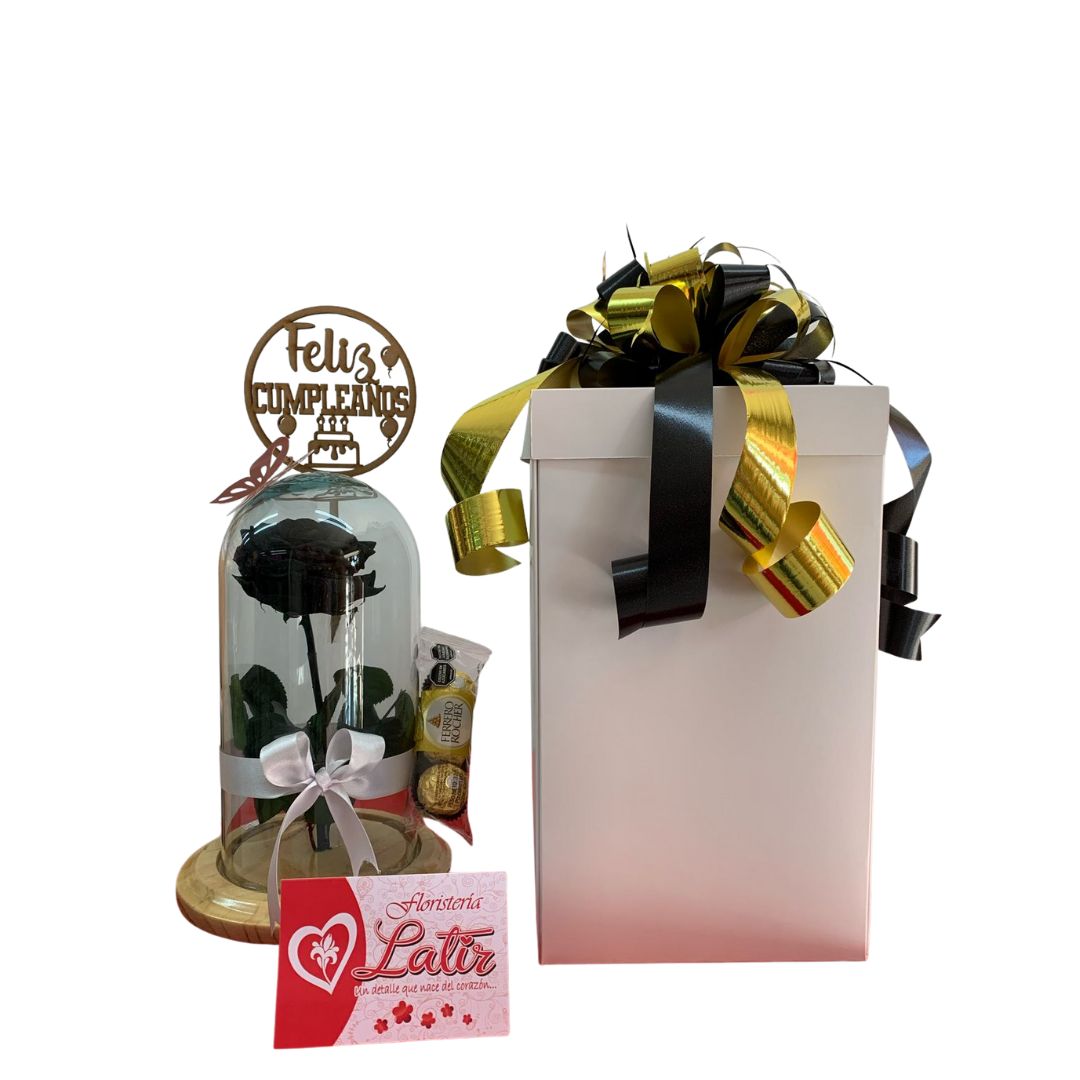 La «Caja Obsidiana» es un detalle elegante y sofisticado que une la profundidad de la rosa preservada negra con la dulzura clásica de los chocolates Ferrero Rocher. Esta combinación en presentación de lujo transmite misterio, elegancia y admiración profunda. Perfecta para sorprender en fechas especiales, celebraciones o simplemente para expresar un amor fuera de lo convencional. Incluye: