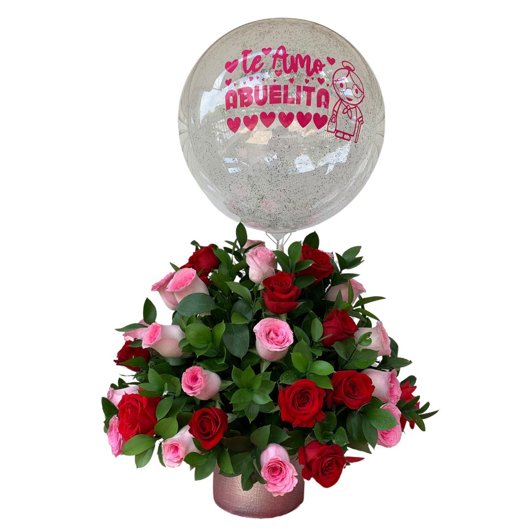 Arreglo redondo con rosas rojas y rosadas, acompañado de globo burbuja decorativo. Delicado y romántico.