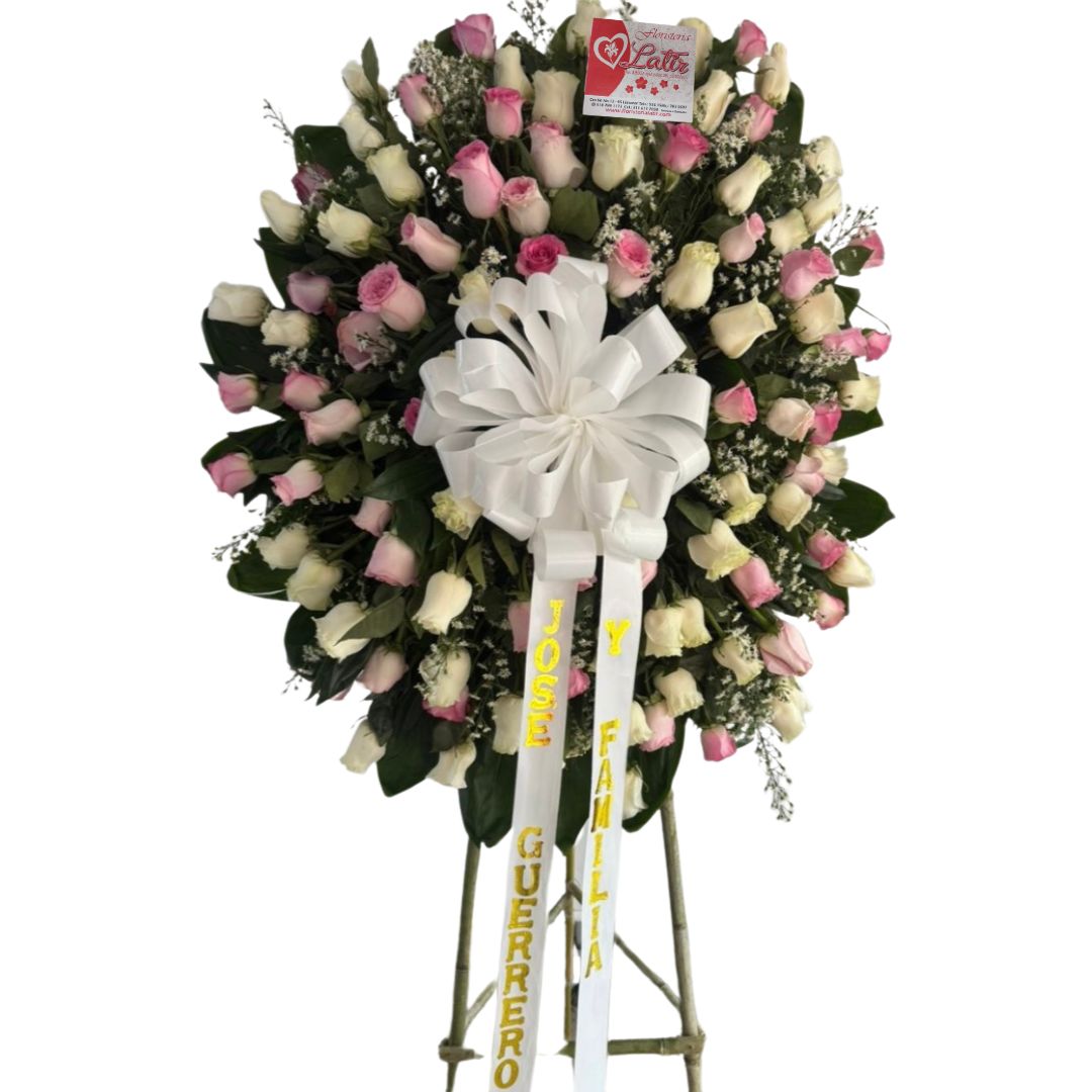 La «Corona Amor y Serenidad» es un arreglo fúnebre majestuoso y lleno de elegancia, perfecto para rendir un homenaje especial y expresar condolencias con respeto y cariño. Combina rosas rosadas, que simbolizan gratitud y amor, con rosas blancas que representan paz y pureza, creando una corona armoniosa y sofisticada para acompañar ceremonias de despedida. Incluye: