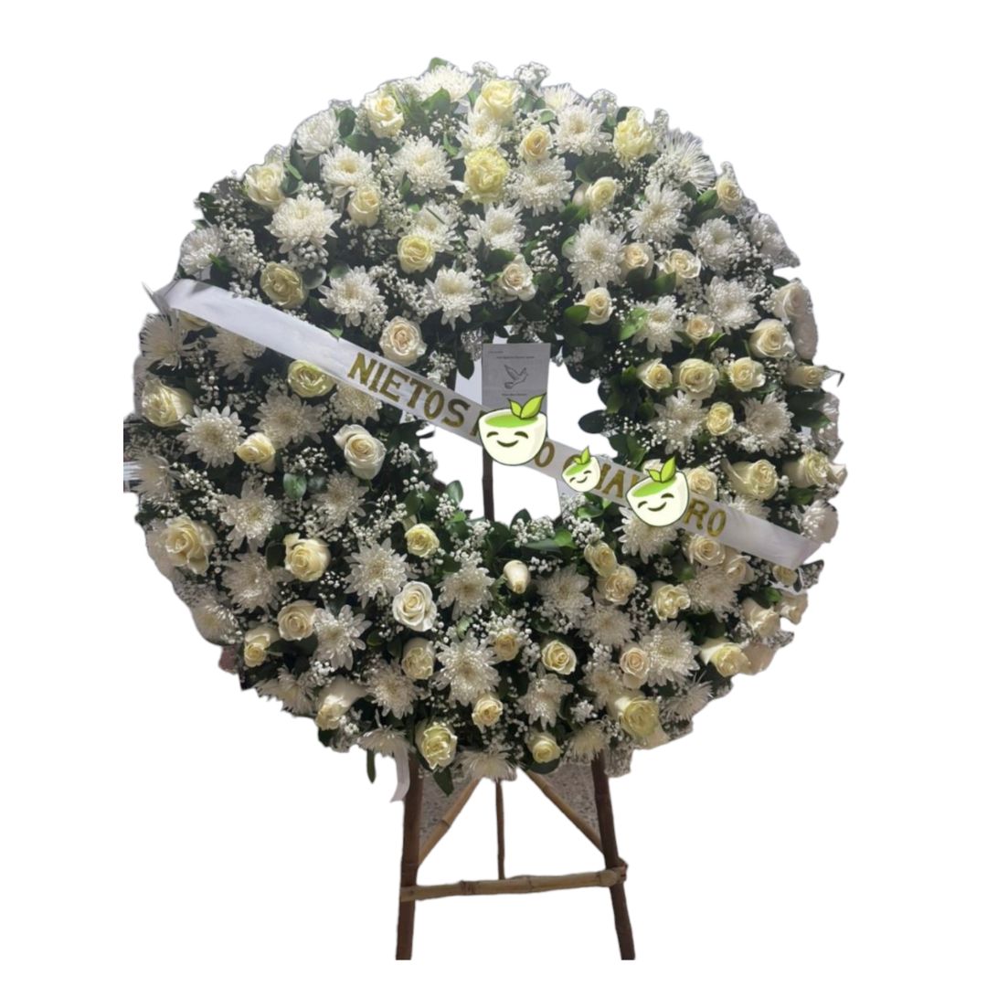 Su diseño tipo rola (corona completa y abundante) destaca por su presencia y tamaño, siendo una opción ideal para expresar condolencias de manera impactante y respetuosa.