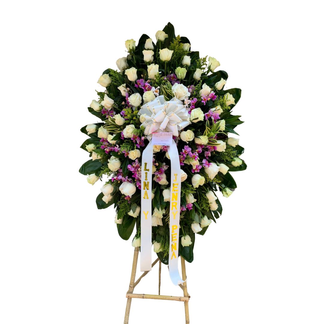 La «Corona Homenaje de Pureza» es un arreglo fúnebre elegante y sofisticado que transmite serenidad, respeto y cariño en momentos de despedida. Combina la pureza de las rosas blancas con la delicadeza de las orquídeas, creando un homenaje floral armonioso y lleno de significado para acompañar a los seres queridos del difunto. Incluye: