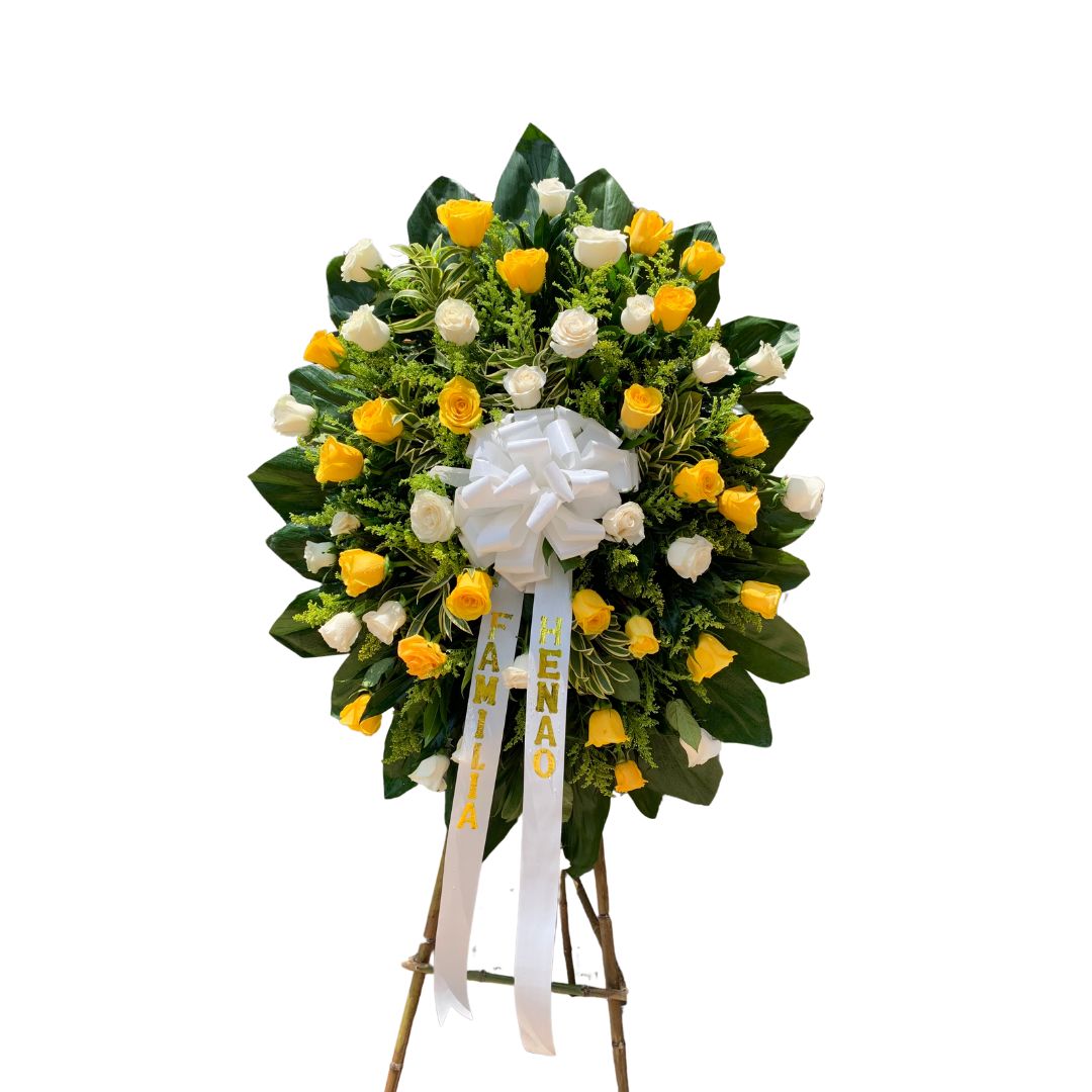 La «Corona Paz y Recuerdo» es un arreglo fúnebre clásico y elegante, ideal para expresar condolencias con respeto y cariño. Combina rosas blancas, símbolo de pureza y paz, con rosas amarillas que aportan luz y serenidad, creando un homenaje floral armonioso y significativo para despedir a un ser querido. Incluye: