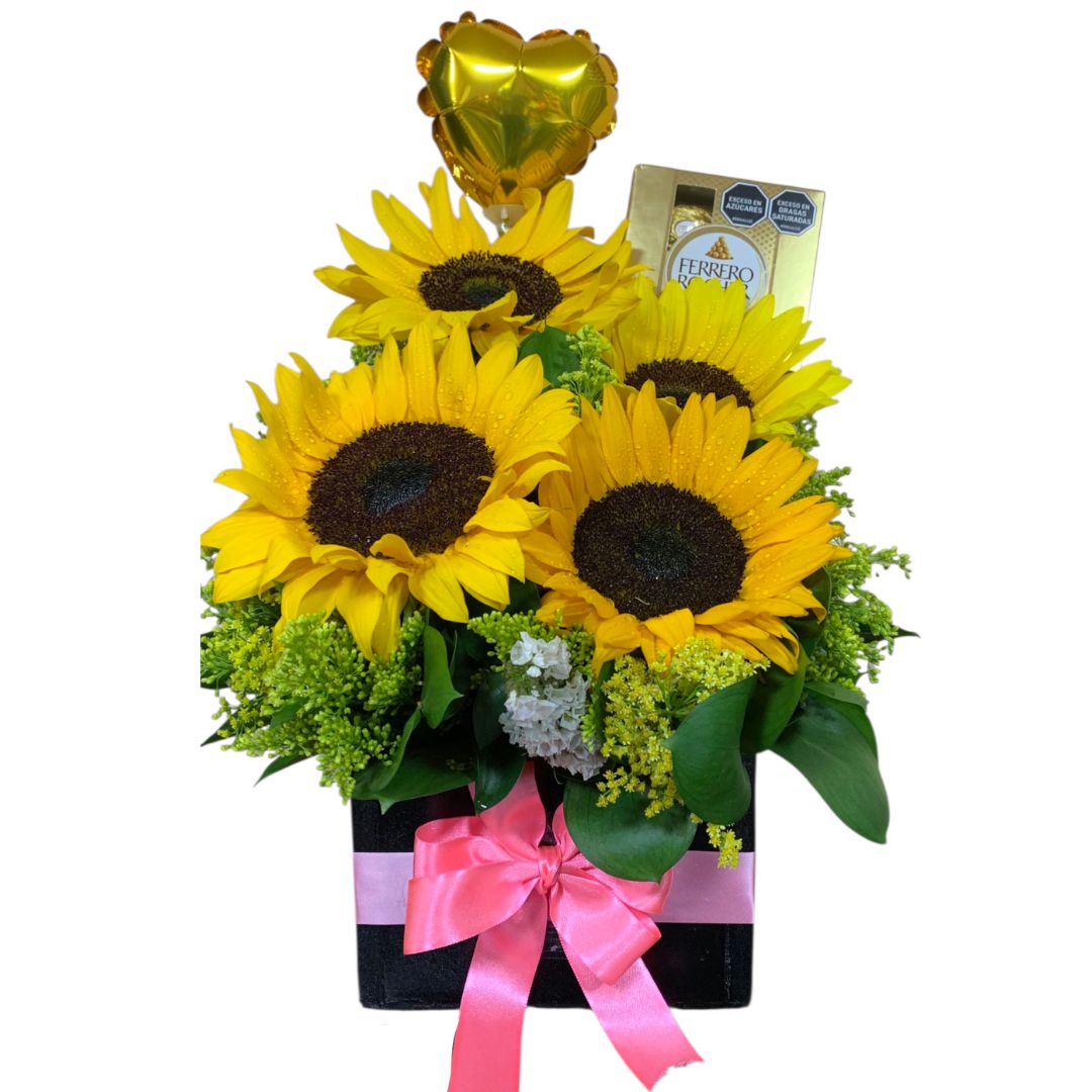 Los girasoles aportan energía positiva, los Ferrero Rocher añaden un toque gourmet, y el globo metálico convierte el arreglo en una sorpresa festiva y moderna.
