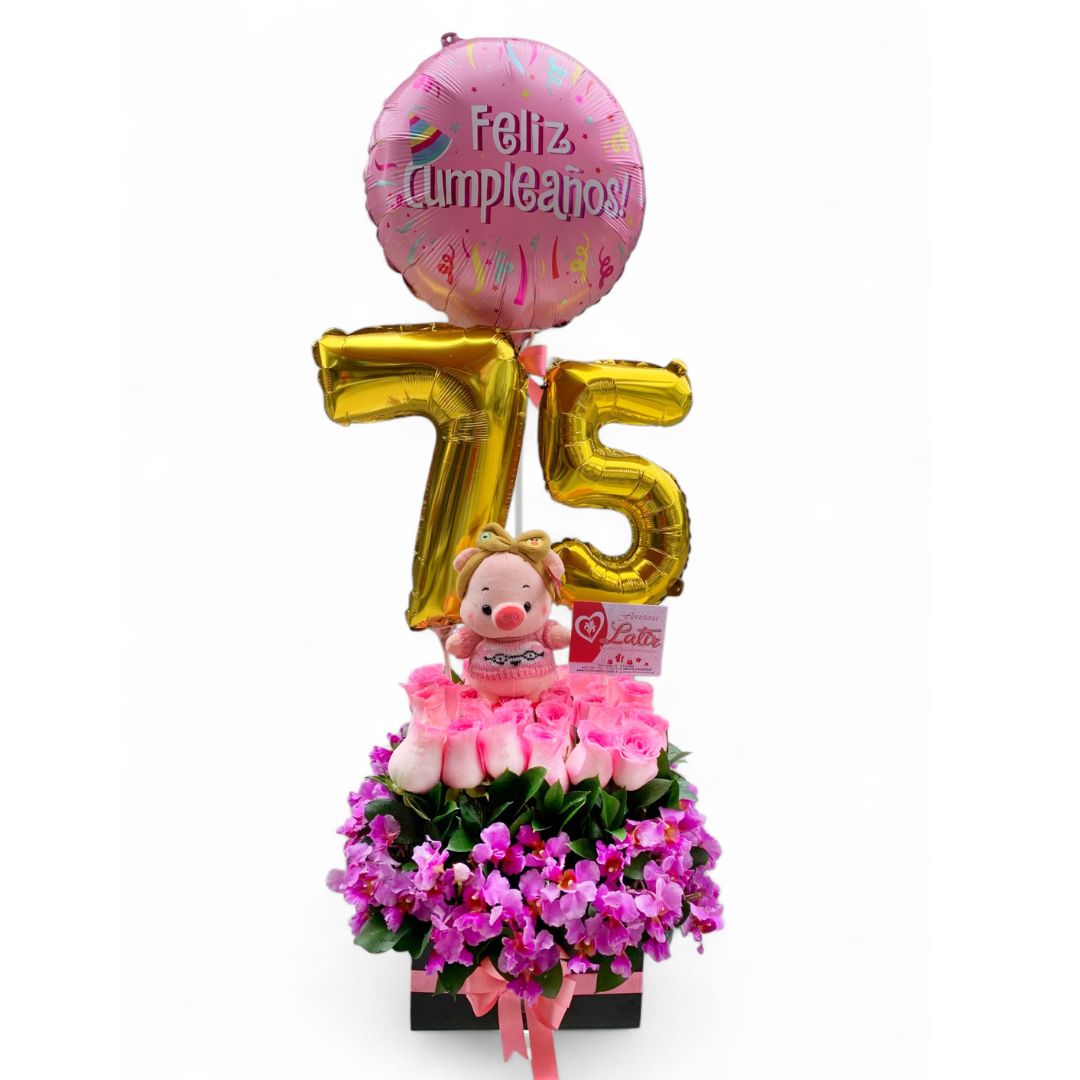 Incluye un peluche, un globo metalizado y globos de números, ideales para celebrar cumpleaños, aniversarios o fechas especiales con un mensaje claro y memorable. Es un detalle completo, alegre y lleno de personalidad.