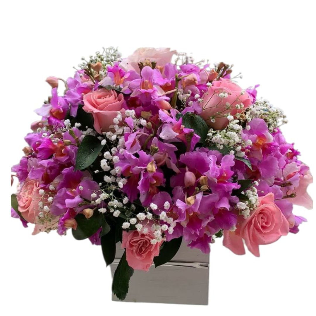 El «Cubo Rosas Rosadas y Orquídeas Hawaianas» es un detalle floral que transmite ternura, elegancia y frescura tropical. Las rosas rosadas reflejan cariño y dulzura, mientras que las orquídeas hawaianas aportan un toque exótico y sofisticado. Todo esto complementado con perla decorativa, que realza la belleza del arreglo. Ideal para regalar en cumpleaños, agradecimientos o para sorprender con algo único y delicado. Incluye: