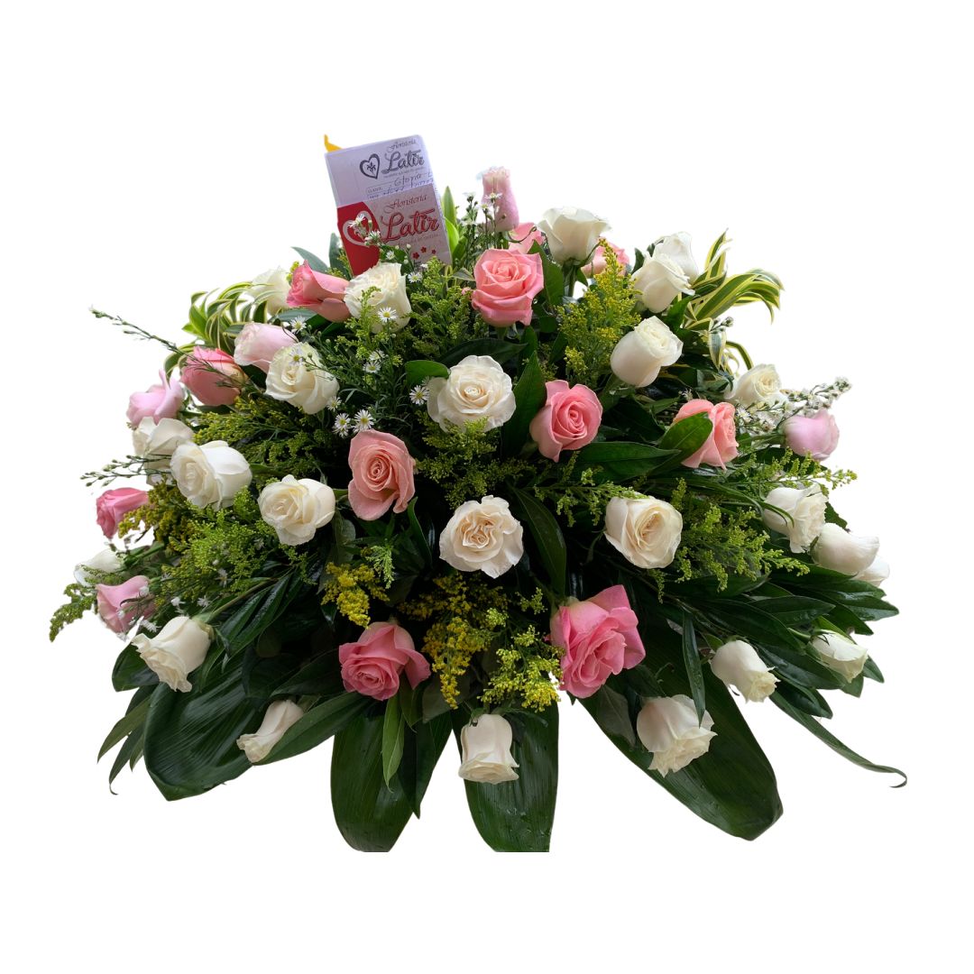 El «Cubre Caja Dulce Recuerdo» es un arreglo fúnebre elegante y delicado, diseñado especialmente para acompañar el ataúd en ceremonias de despedida. Combina la suavidad de las rosas rosadas, símbolo de cariño y gratitud, con la pureza de las rosas blancas, creando un detalle lleno de respeto y serenidad para rendir un último homenaje. Incluye: