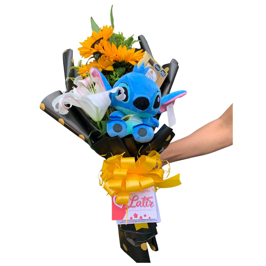 El «Detalle Mágico» es una combinación única de ternura, color y dulzura. Perfecto para regalar sonrisas y alegría, este arreglo incluye girasoles vibrantes, un tallo de lirio elegante, un adorable peluche de Stitch y deliciosos chocolates Ferrero Rocher. Una opción encantadora para sorprender de manera original. Incluye: