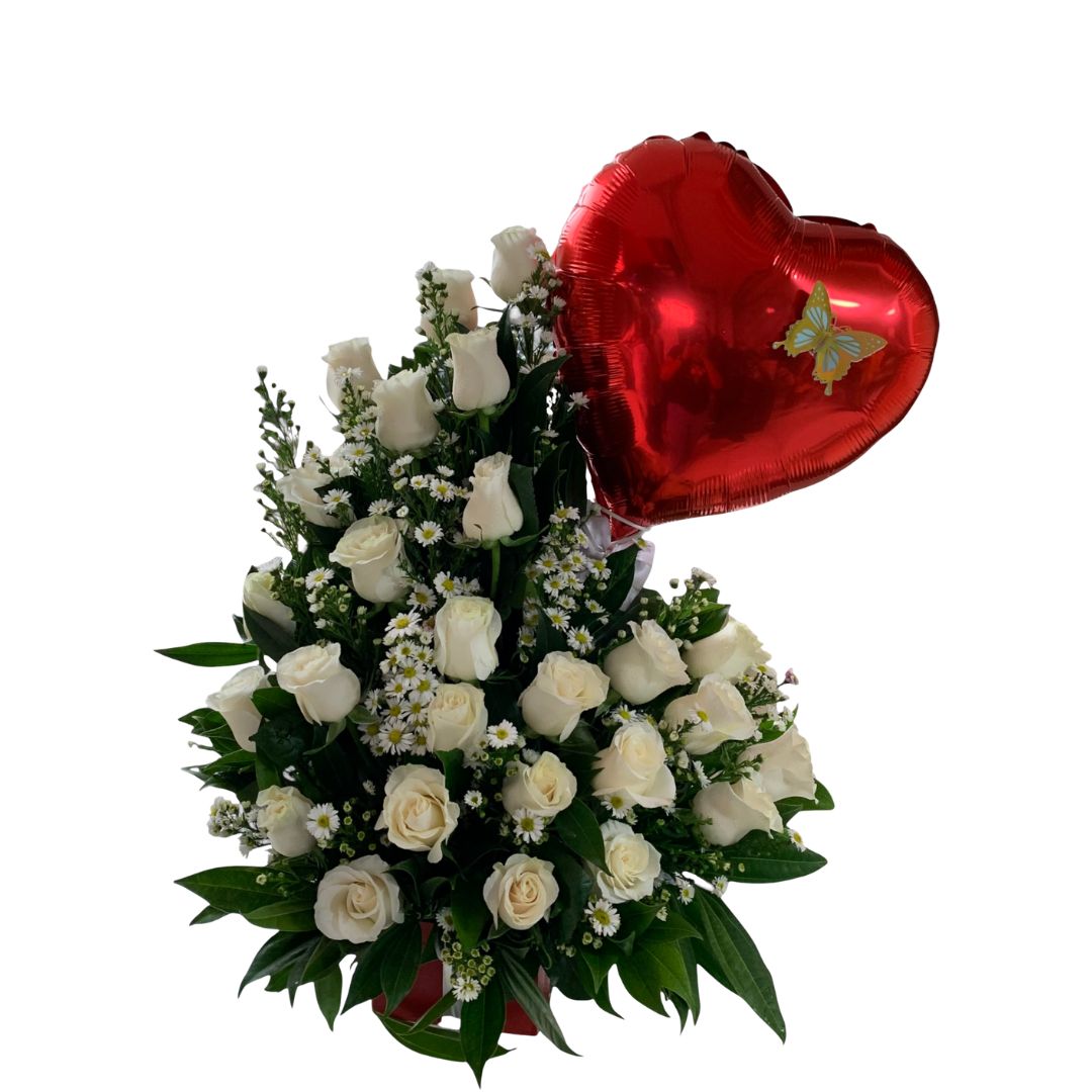Arreglo en media luna con rosas blancas y globo metalizado. Elegante, delicado y lleno de significado.