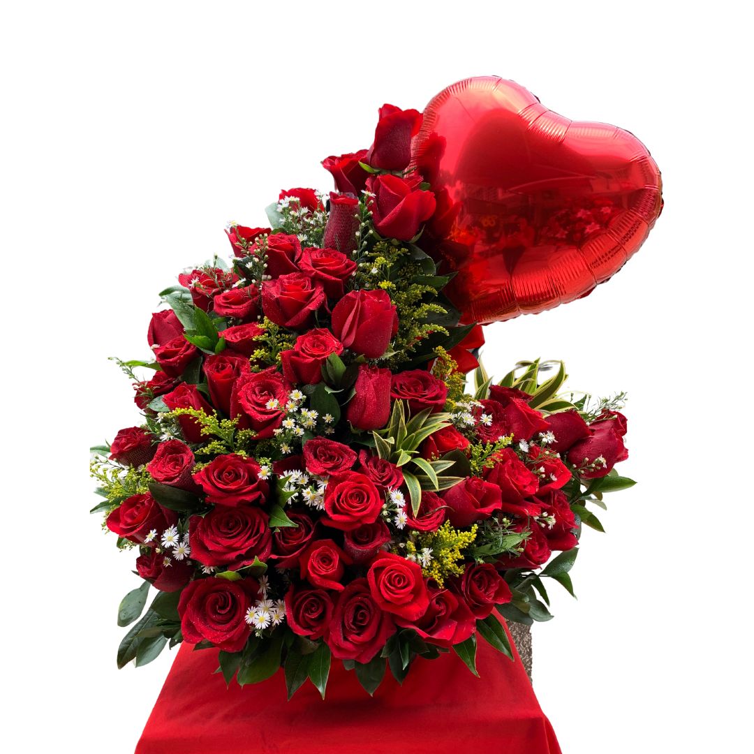 El «Media Luna Roja» es un arreglo floral sofisticado que representa amor profundo y celebración. Su diseño en forma de media luna crea un efecto visual armónico, mientras las rosas rojas transmiten pasión, respeto y fuerza emocional. El toque final lo da un globo metalizado que añade alegría y un aire festivo. Incluye: