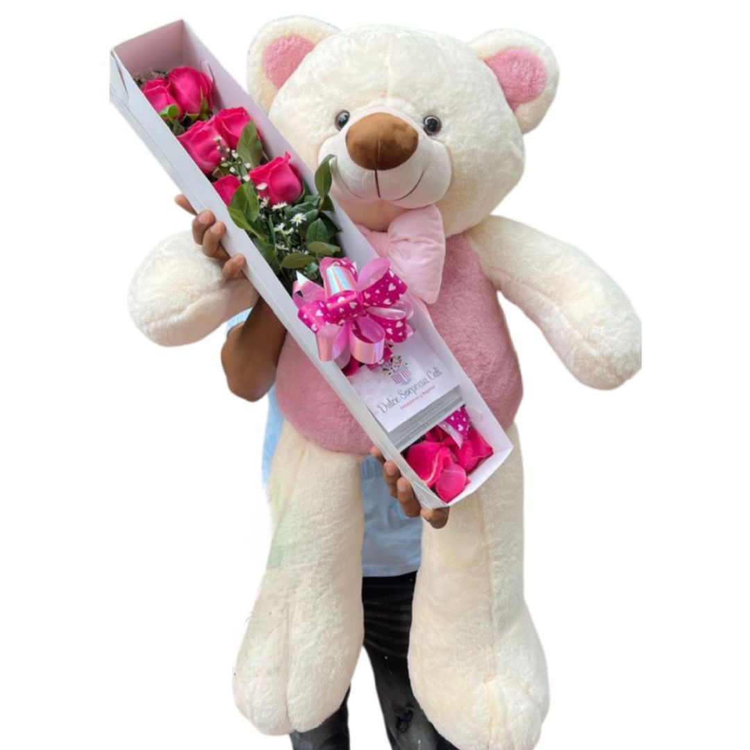 El Oso de Peluche de 120 cm con Caja de Rosas Fucsia es un regalo imponente y tierno que une la suavidad de un peluche gigante con la elegancia y alegría de las rosas fucsia.