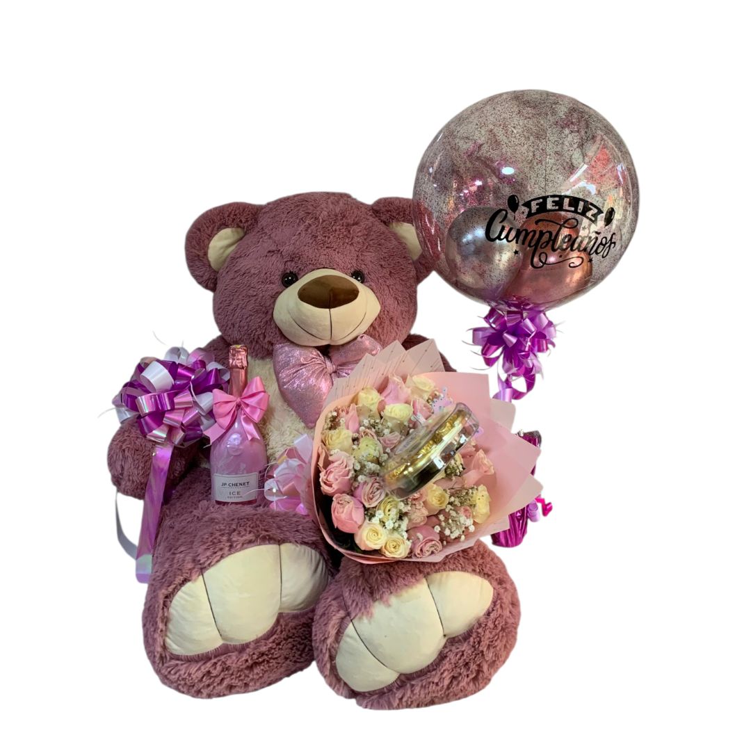 Incluye un oso de peluche, un hermoso buquet de rosas frescas, chocolates Ferrero Rocher, una botella de licor J.P. y un globo burbuja, creando una experiencia completa que transmite amor, alegría y cuidado en cada detalle.